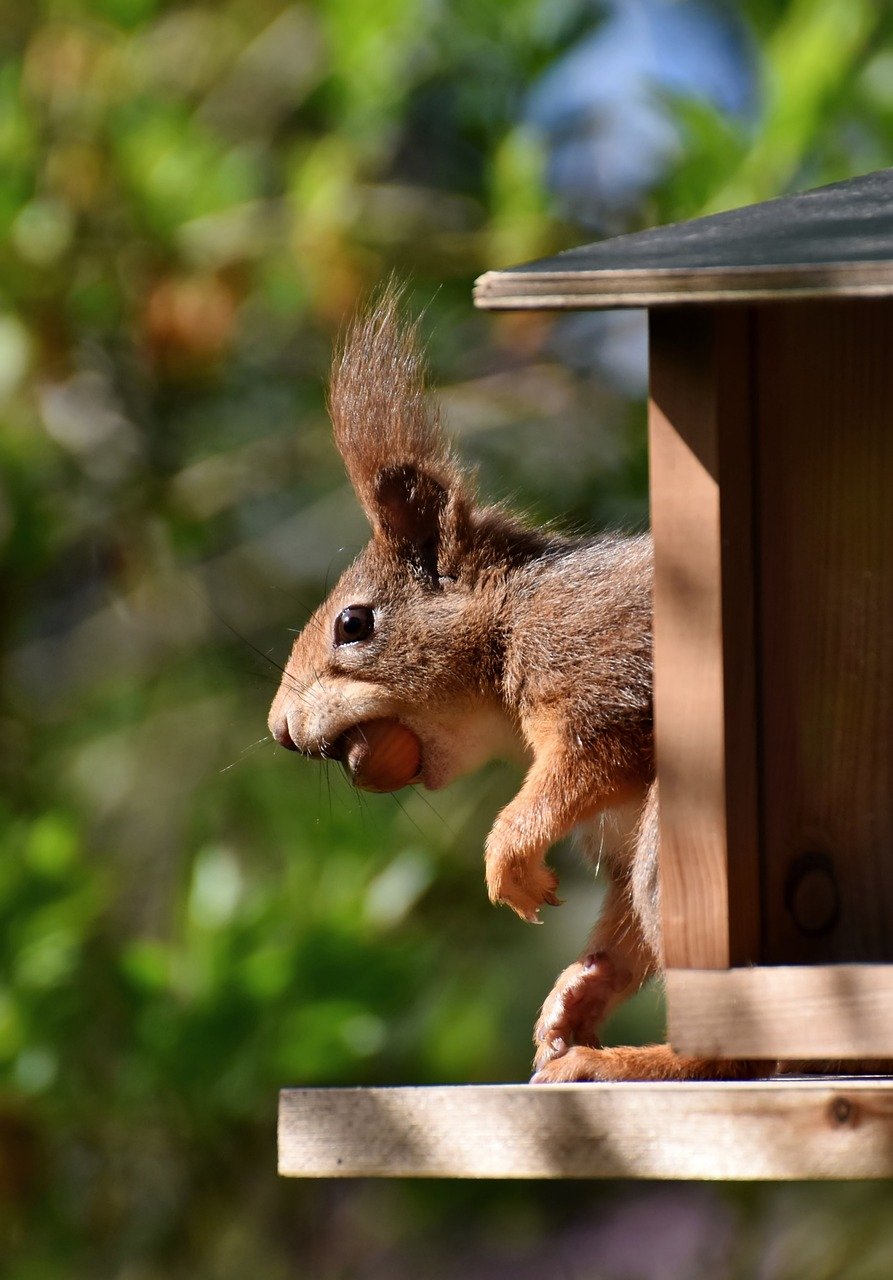 Lorsqu'il pleut et que les oiseaux se cachent, il est fréquent de voir un écureuil s'aventurer vers une mangeoire d’oiseaux…